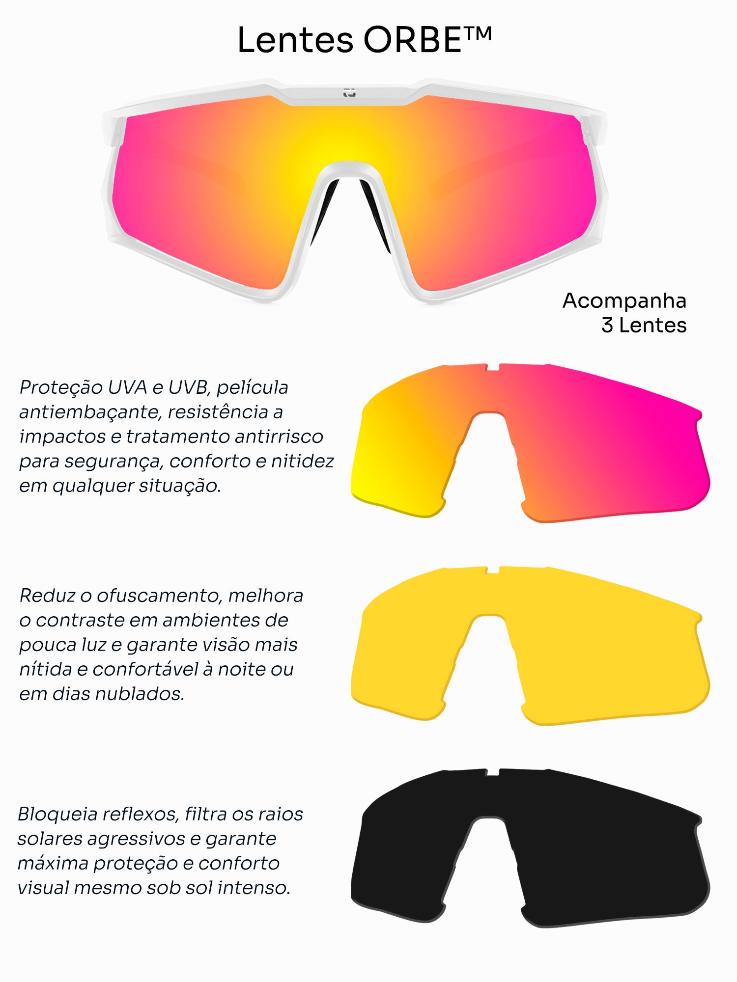 Todas com camada antiembaçamento e tratamento anti-impacto, testadas sob alto impacto para máxima segurança e estabilidade. Ideal para esportes ao ar livre, ciclismo, beach tennis, trilha, caiaque.